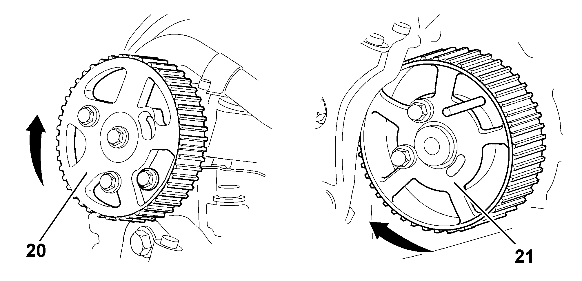 IMPERATIVE : by inserting one bolt (19) in each pulley (20) and (21), make sure that the bolts (19) are not against the end of the slot; if this is not the case : repeat the timing belt fitting operation .