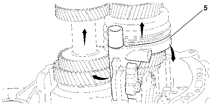 Refit the reverse gear and shaft (2), the tooth lead (A) facing downwards .
