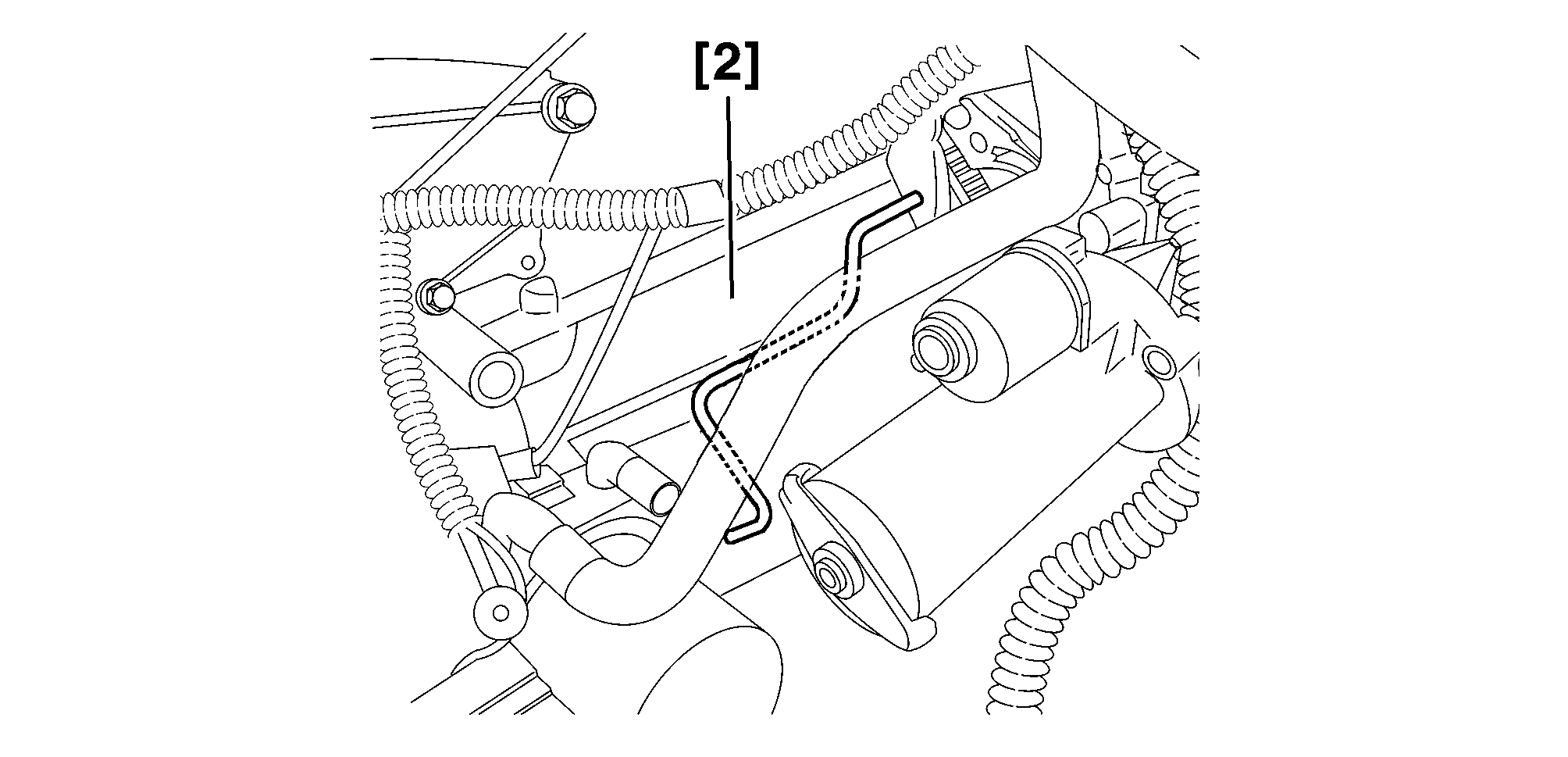 Peg the flywheel using the rod [2] (Without removing the starter motor) .