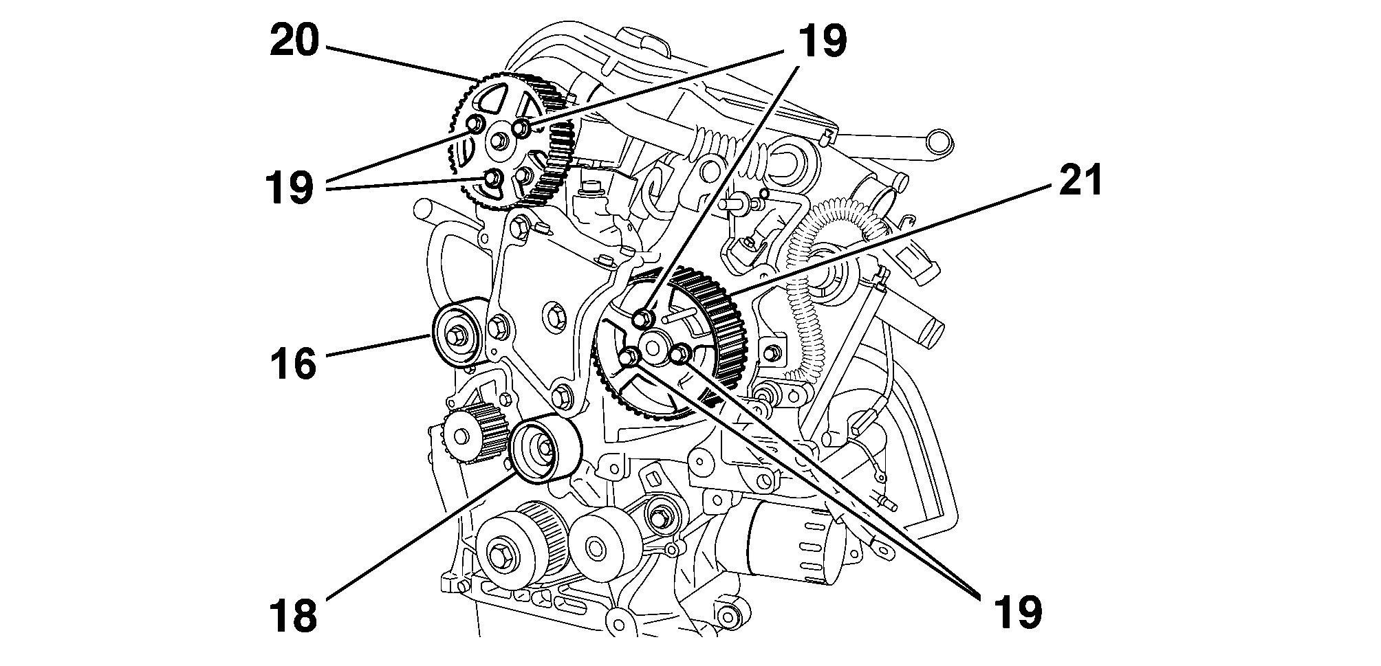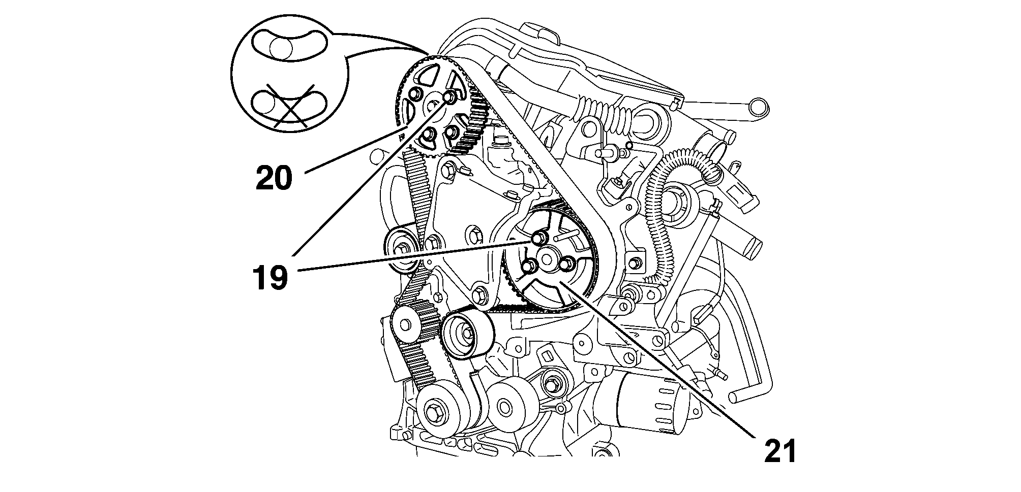 IMPERATIVE : by inserting one bolt (19) in each pulley (20) and (21), make sure that the bolts (19) are not against the end of the slot; if this is not the case : repeat the timing belt fitting operation .