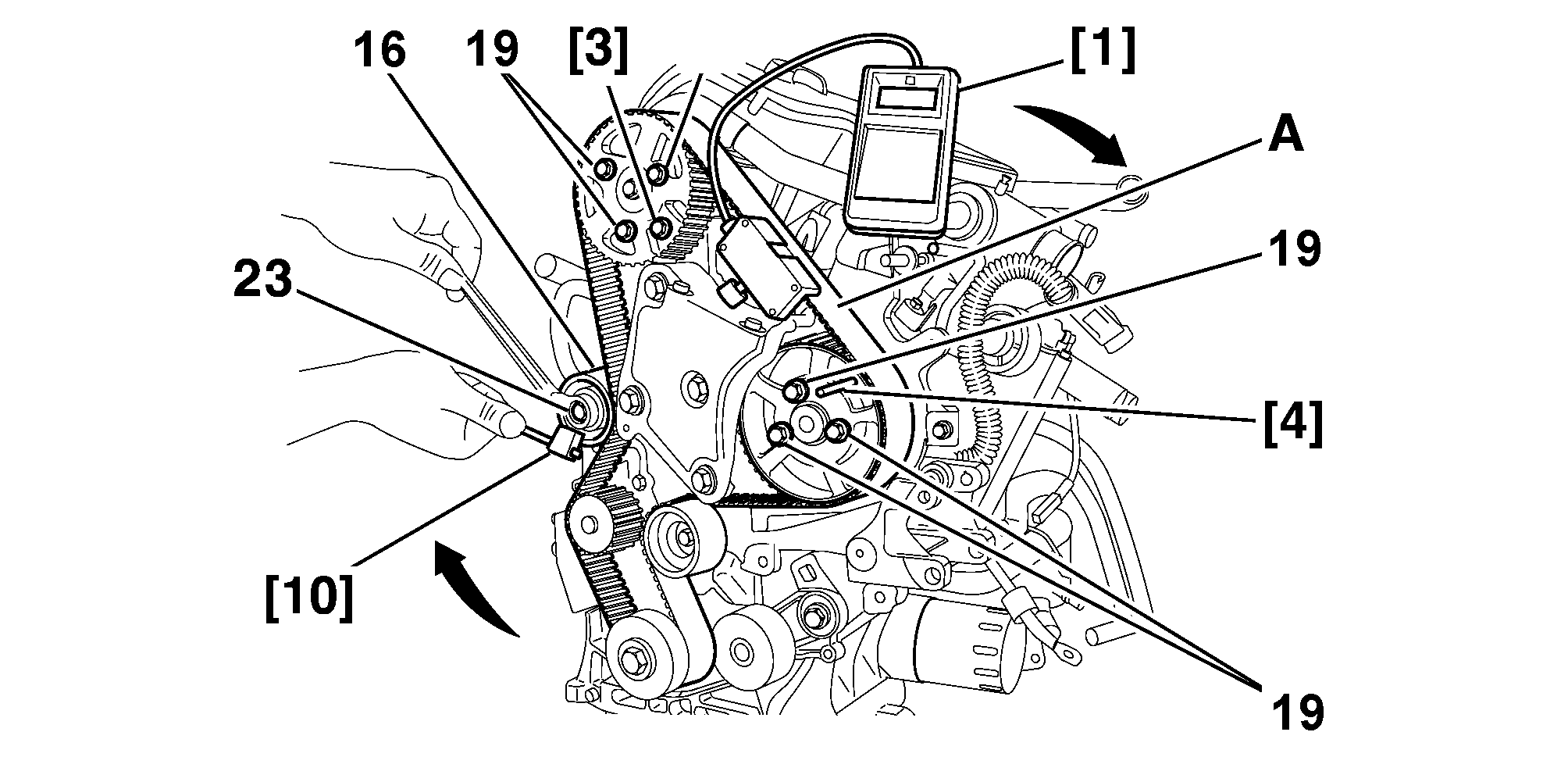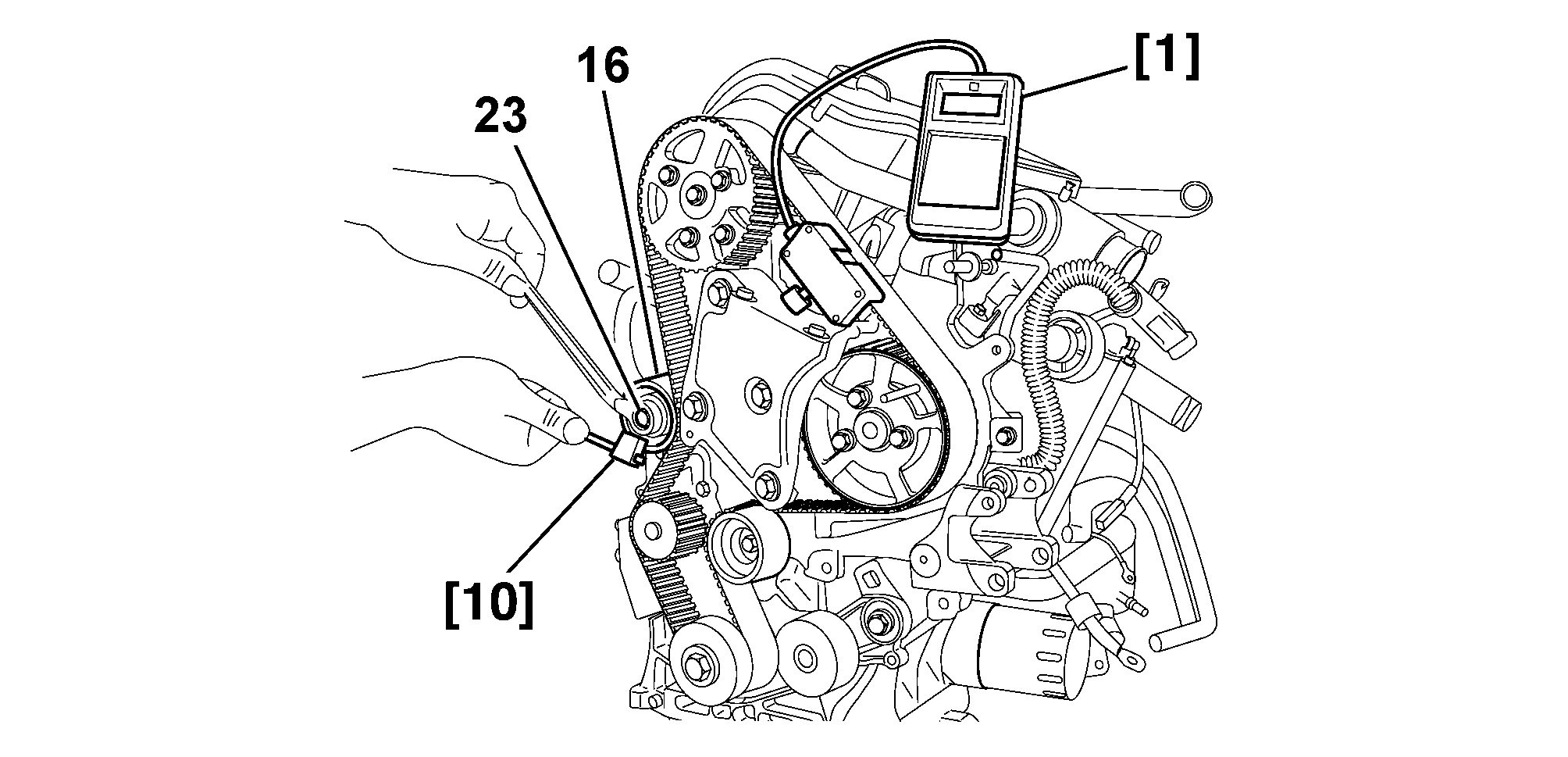Turn the roller tensioner (16) anti-clockwise (Using the tool [10]) .