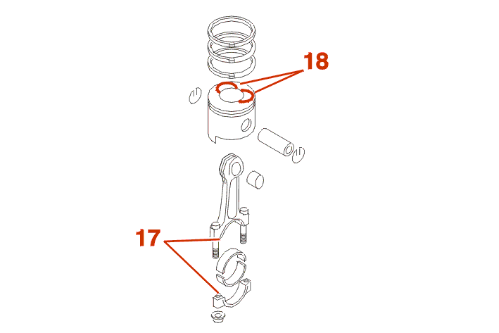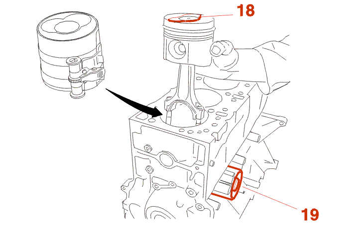 Assemble the connecting rods and pistons directing the notches (17) to the side opposite the recesses (18) on the pistons .