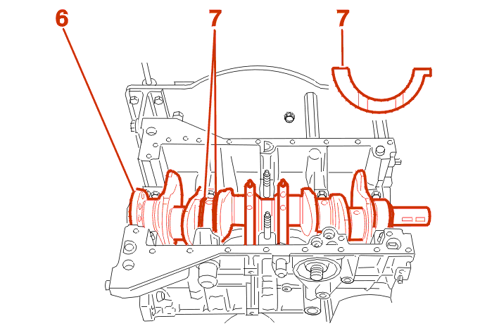 Fit the grooved main bearing half-shells (5), on the cylinder block side .