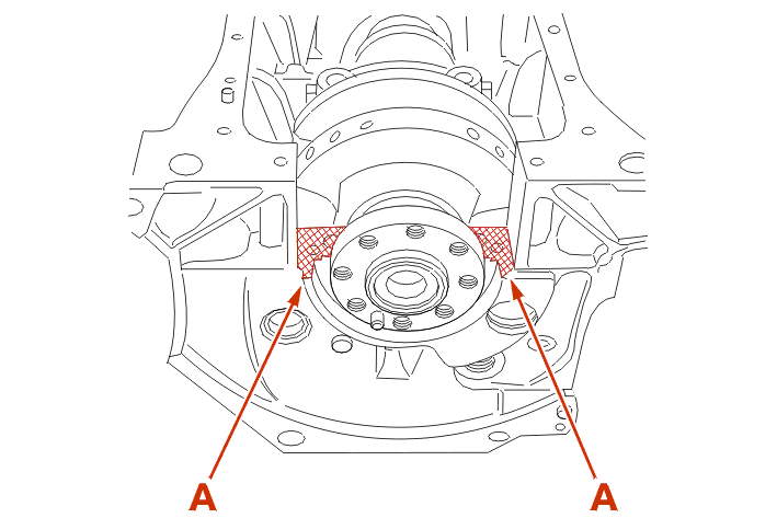 APPLY (E10) SEALING COMPOUND TO THE CORNERS AND ENDS (A) OF MAIN BEARING NO. 1 .