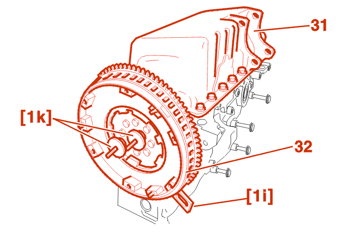 RETAIN THE ENGINE FLYWHEEL (32) IN PLACE USING THE CENTRING PINS AND FASTENERS OF THE TOOL (1K) .