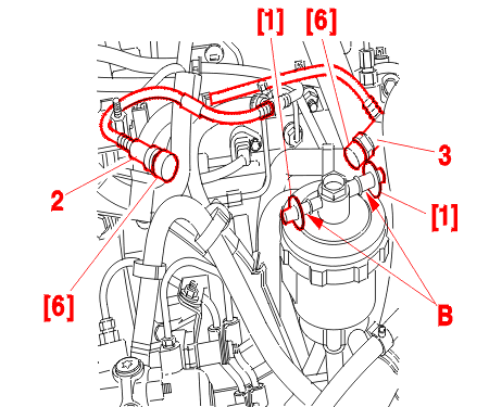 Block the unions on the fuel filter assembly at (B) : USING THE TOOLS [1] .