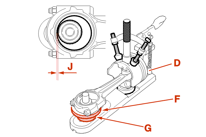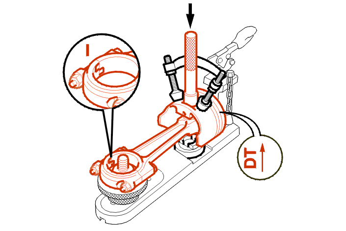Place the connecting rod with its cap (without shells) in the piston and centralise it with the handle/gudgeon pin end piece assembly .