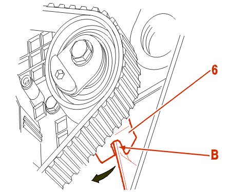 Remove the roller bracket (6) from the rib (B) of the cylinder block (to allow it greater movement) .