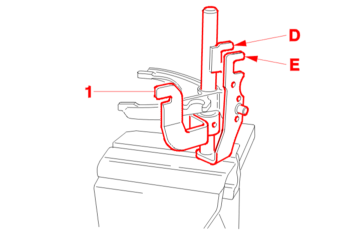 Observe the positioning of the control lugs (D) and (E) and the reverse relay (1) .