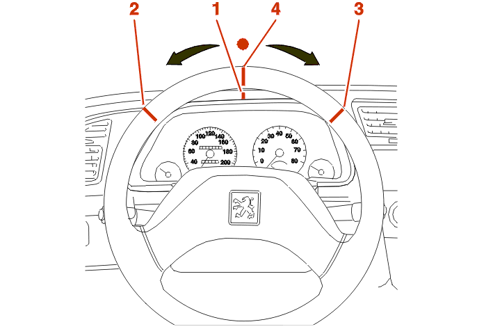 Halve the distance between the 2 steering wheel marks and make a 3rd mark (4) .