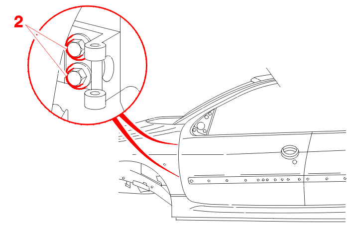 Tighten the bolts (2) on the front pillar using an open ended spanner inserted via the wheel arch .