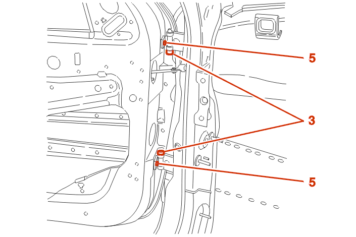 Open the door and tighten the door hinge mountings (5) .