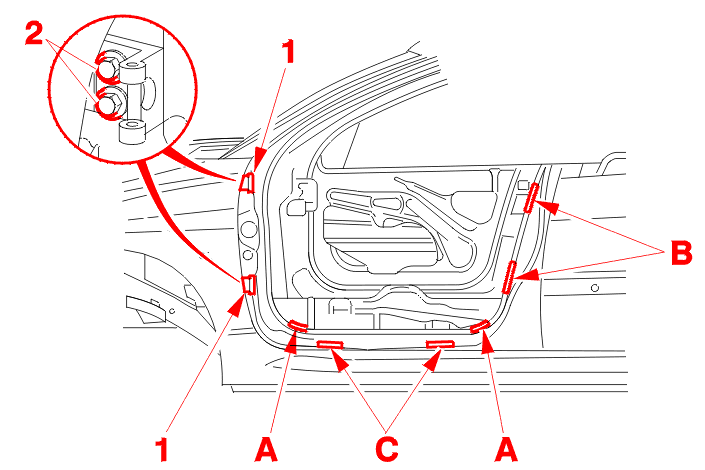 Fit the hinges (1) fitted with centralising pins on the front pillar .