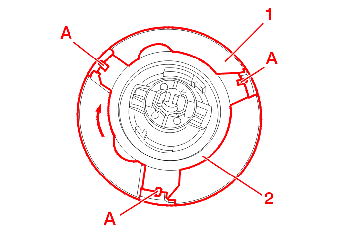 Press and turn (opposite direction to the arrow) the cap (2) to detach it from the lugs (A) of the cover .