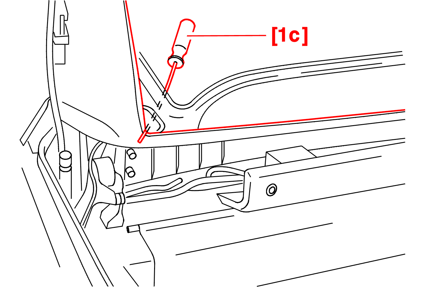ROUTE THE AWL [1C] ACROSS THE BEAD OF ADHESIVE, IN THE LEFT LOWER CORNER, FROM THE INSIDE OUTWARDS .