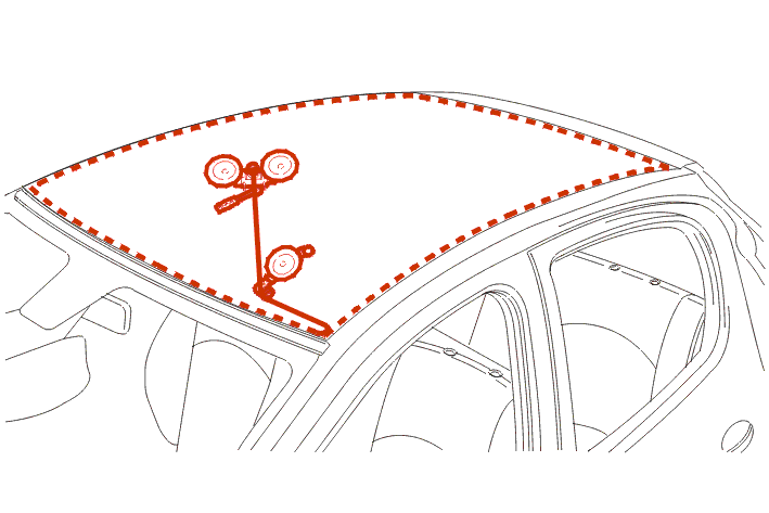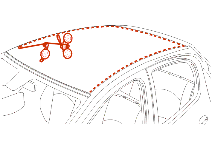 Positioning of the double suction cups [4] on the glass roof before placing on the vehicle .