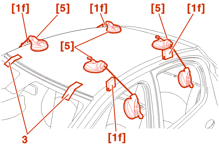 WARNING : for the following operation three people are required, two to bring the glass headlining above the vehicle and one sitting in the rear seats to support it while it is being adjusted to the markers (3) and the shims [1f] .