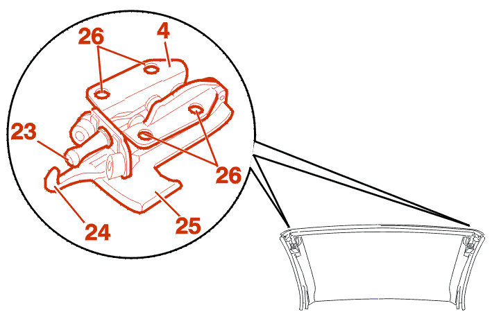 The 2 front locking systems (4) are secured to the front moving panel by 8 fixings (26) and hook onto 2 strikers secured on the windscreen aperture .