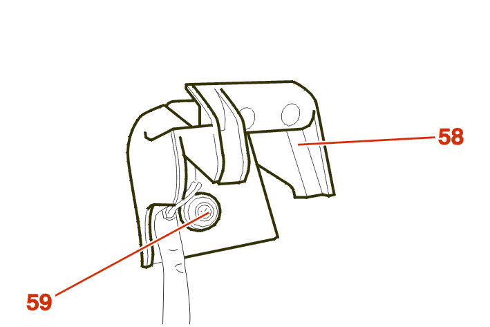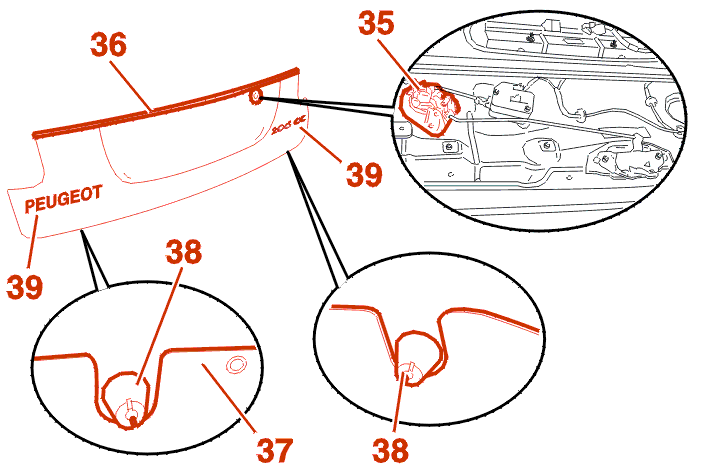 The two screen (luggage cover) right and left supports (58) are secured at the back of the boot by 2 fixings (59) (presence of a screen extended switch on the support, left-hand side only) .